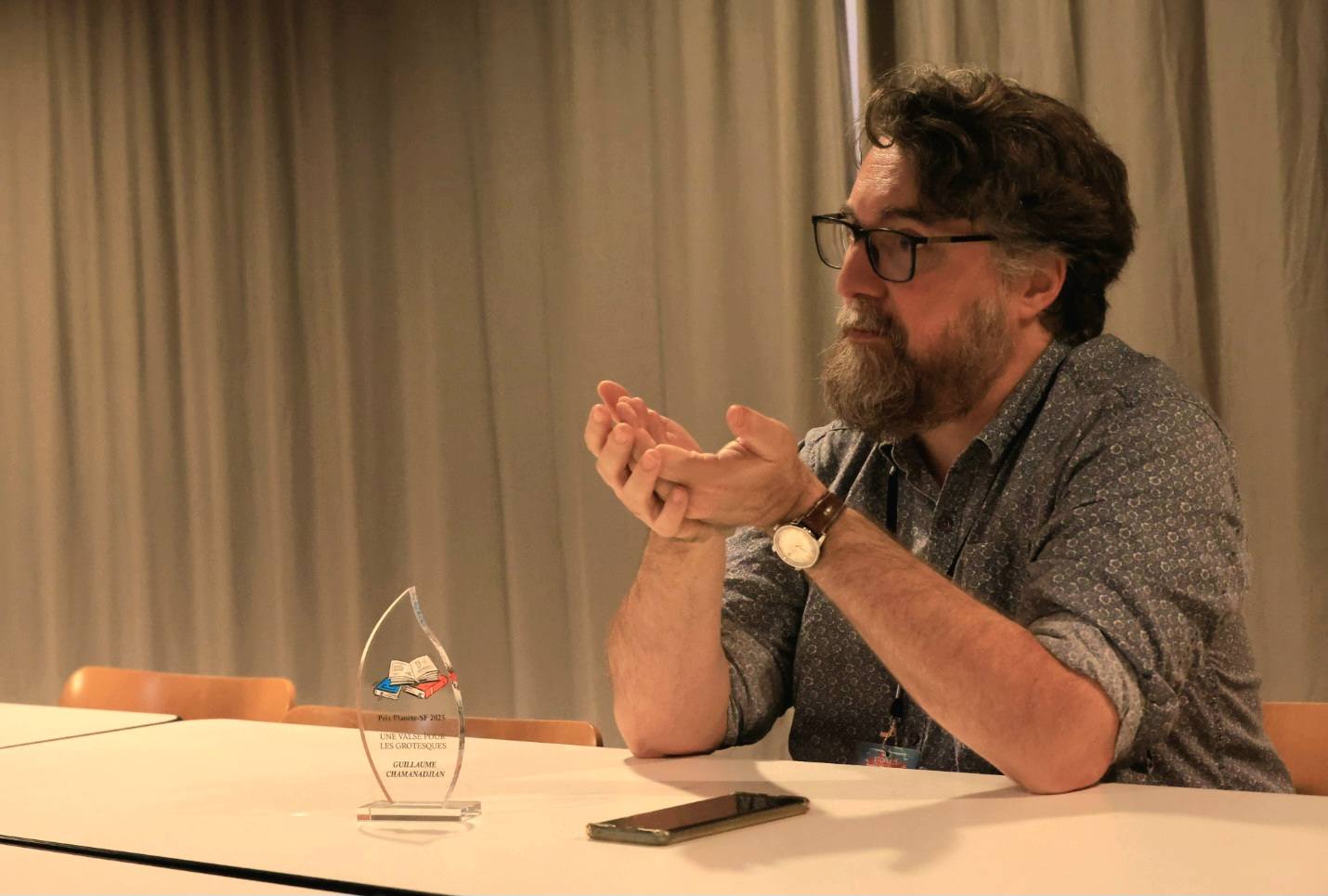 Le lauréat n’ayant pas pu se rendre au festival, c’est David Meulemans, éditeur chez Aux Forges de Vulcain, qui a reçu la statuette en son nom. Il était entouré de plusieurs membres du jury : Gromovar (Quoi de neuf sur ma pile), Cédric Jeanneret (Reflets de mes lectures), Tigger Lilly (Le dragon galactique) et Lhisbei (RSF Blog). À cette occasion, David Meulemans a lu au public un texte envoyé par Guillaume Chamanadjian, que nous partageons ci-dessous.